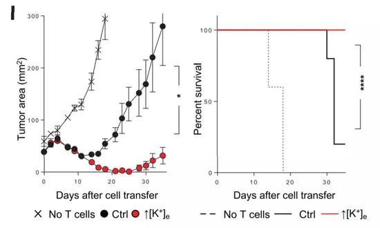 在小鼠體內(nèi) ,這些細(xì)胞的療效也得到了證實(shí) 。同樣是經(jīng)過(guò)鉀離子的處理后,擴(kuò)增的T細(xì)胞被輸注回了黑色素瘤小鼠體內(nèi)。研究發(fā)現(xiàn),沒(méi)有接受任何T細(xì)胞輸注的小鼠,不到20天就全部死亡 ;接受普通T細(xì)胞輸注的小鼠雖然活得更久 ,但在治療的30多天后 ,死亡率就接近80% 。相比之下 ,已經(jīng)在體外歷經(jīng)過(guò)鉀離子洗禮的T細(xì)胞 ,面對(duì)惡劣的腫瘤微環(huán)境 ,展現(xiàn)出了驚人的治療效果 。30多天后,小鼠的存活率高達(dá)100% ,腫瘤面積也得到了很好的控制 。